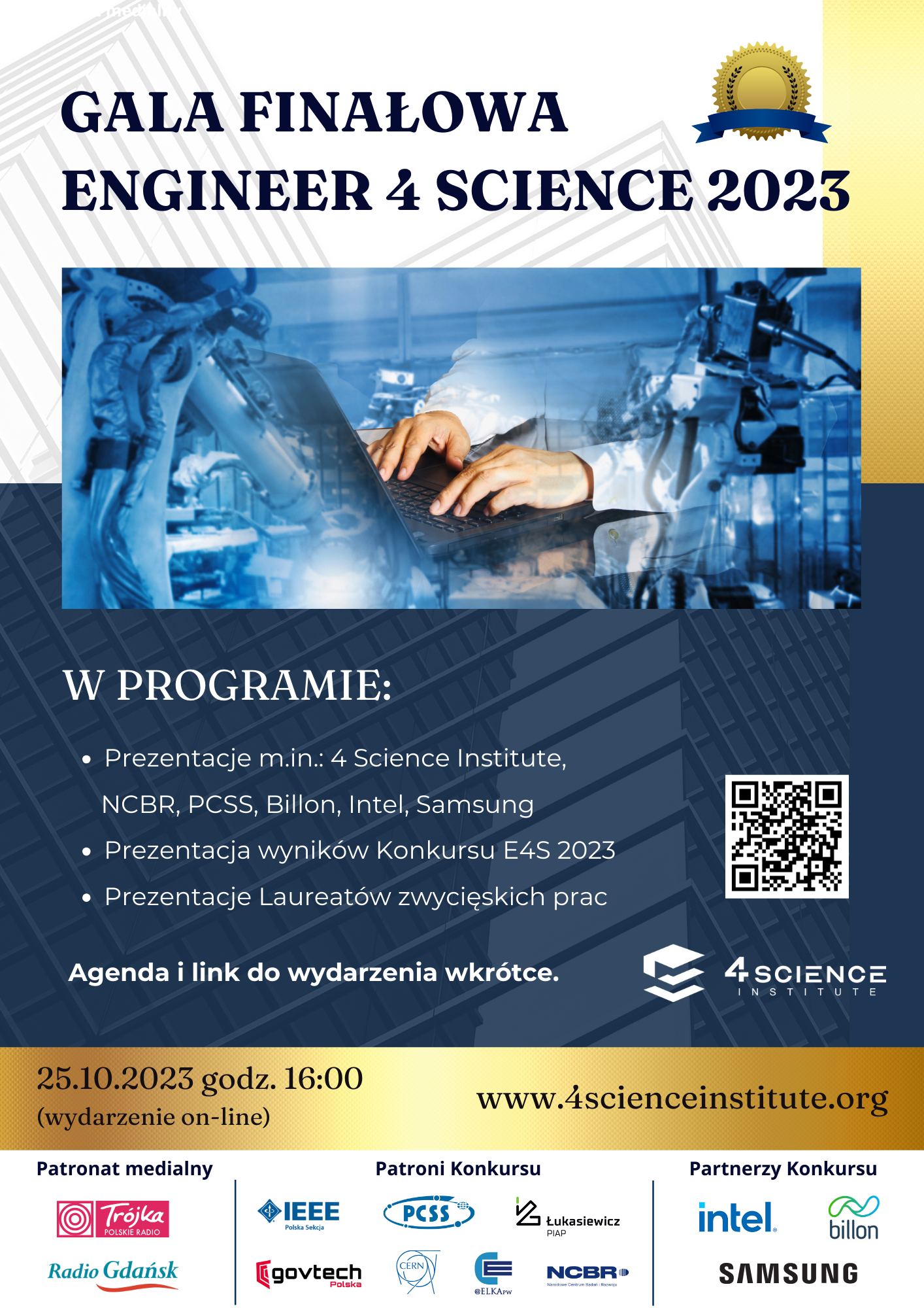 Zachęcamy do uczestnictwa w Gali Finałowej Konkursu Engineer 4 Science 2023 zaplanowanej w dniu 25.10.2023, początek o godzinie 16:00. W programie przewidziane są wystąpienia Patronów m.in.: GovTech, NCBR, PCSS, Billon, Intel, Samsung, IEEE – Standards And More oraz Laureatów Konkursu. Informacje o laureatach z naszego wydziału oraz o ich pracach można znaleźć tutaj.